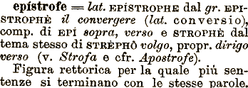 gr. epistrofe === lai. EPISTROPHJE dal BPISTROPHÈ ti convergere (lai. e o ny ersi o), comp. di EPÌ sopra, verso e STROPHE dal tema stesso di STRÈPHÓ volgo, propr. dirigo verso (v. Strofa e cfr. Apostrofe). Figura rettorica per la quale più sentenze si terminano con le stesse parole.