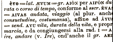 plur. anch consuetudine, costumanza), affine ad AYUÌ === zend. AYU vita, durata rata o corso di tempo, conforme al sscr. ÈVAi ==== AIVAS andata^ viaggio (al della vita., e propr marcia, e da congiungersi èvo===^. 2EV\JM====gr. AIÒN perAirÒN du alla rad. i == A ire, andare (v. Ire), ond5 anche il gr. AEI