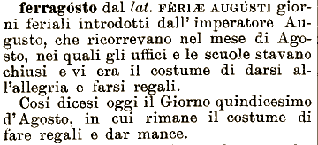 Giorno quindicesimo d'Agosto, in cui rimane il costume di fare regali e dar dal? imperatore Augusto, ferragósto dal lat. FERINE AUGUSTI giorni feriali introdotti che ricorrevano nel mese di Agosto, nei quali gli uffici e le scuole stavano chiusi e vi era il costume di darsi alPallegria e farsi regali. Cosi dicesi oggi il mance.