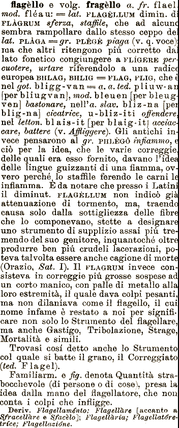 strumento offendere, nel lettori, blais-it [per blaig-itj acciaccare, battere (v. flagèllo e volg. fratèllo a. fr. fiael mod. fiéau: == lai. FLAGÈLLUM dimin. di FLÀGRUM sferza, staffile, che ad alcune Flagellare [accanto che 6 nel (fot. bligg-van=== a. a. ted. di supplizio assai più tremendo del suo genitore, inquantoché oltre produrre dalla sottigliezza delle fibre che lo componevano, stette a designare uno ben più crudeli lacerazioni, poteva talvolta essere anche cagione di morte (Orazio, Sat. I). del flagellatore, che non conta i colpi che infligge. Deriv. Flagellaménto; Il FLÀGRUM invece consisteva in correggie più grosse sospese ad un corto manico, con palle di metallo alla loro estremità, il quale dava colpi pesanti, ma non dilaniava come il flagello, il cui nome infame è restato a noi per significare non solo lo Strumento del flagellare, ma anche Castigo, Tribolazione, Strage, Mortalità e simili. Trovasi cosi detto anche lo Strumento col quale si batte il grano, il Correggiato {ted. Flagel). Familiarm. e fig. denota Quantità strabocchevole (di persone o di cose), presala idea dalla mano pliuw-ai] [per i g -n a] cicatrice, bliugvan], mod. bleuen [per bleugven]. bastonare, nelPa. slav. bliz-na [pei b 1 non indicò già attenuazione di tormento, ma, traendo causa solo u-bliz-iti Affliggere). Gli antichi invece pensarono al gr. PHLÈGÒ infiammo, 6 ciò per la idea, che le varie sembra rampollare dallo stesso ceppo de] lai. PLAGA ==== gr. PLÈGÈ piaga (v. q. voce) ra a che altri ritengono più corretto ELICERE percuotere, urtare riferendolo a una radice europea BHLAG, BHLIG === FLAG, FLIG, correggie delle quali era esso fornito, davano l'idea delle lingue guizzanti di una fiamma, ovvero perché, lo stanile ferendo le carni le infiamma. E da notare che presso i Latini il diminuì. FLAGÈLLUM da] lato fonetico congiungere a a Sfracellare e Sfacèlo]; Flagellano; Flagellatoretrfce; Flagellazione.