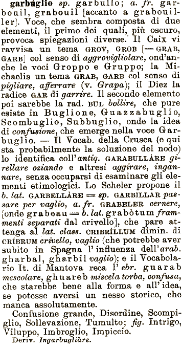 BUL bollire, voce Garbuglio. — II Vocab. della Crusca (e qui sta probabilmente la soluzione del nodo) lo identifica che pure esiste in Buglione, Guazzabuglio, Scombuglio, Subbuglio, onde la idea di confusione, col senso di pigliare, va reca P ebr. guarab mescolare, ghuareb miscela torba, confusa, che emerge nella di Manto garbùglio 5p. garbulto; a. /r. garbouil, gr ab ou il [accanto a grabouiller]. Voce, che sembra composta di due elementi, il primo dei quali, più oscuro, provoca spiegazioni diverse." Il Oaix vi ravvisa un tema GROV, GROB [===GRAB, GARE] col senso di aggrovigliolare, ond'anche le voci Groppo e Gruppo; la Michaelis un tema ORAB, GARE colVantiq. GARABULLÀRE girellare oziando e altresì aggirare, ingannare, senza occuparsi che starebbe bene alla forma e al? idea, se di esaminare gli elementi etimologici. Lo Scheler propone il 6. lai. GARBELLÀRE === sp. GARBILLAR passare per vaglio, a. fr. GRABELER cernere, [onde grabeau=» 6.7a.grabòtum/rammenti separati dal crivello], che pare attenga al lat. class» CRIBRILLUM dimin. di CRIBRUM crivello, vaglio (che potrebbe aver subito in Spagna sarebbe la rad. P influenza dell* arab. gharbal, gharbil vaglio)', e il Vocabolario It. afferrare (v. Grapa), il Diez la radice GAR di garrire. Il secondo elemento poi potesse aversi un nesso storico, che manca assolutamente. Confusione grande, Disordine, Scompiglio, Sollevazione, Tumulto; fig. Intrigo, Viluppo, Imbroglio, Impiccio. Deriv. Ingarbugliare.