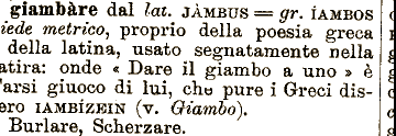 usato ^iambāre dal lai. JĀMBUS === gr. ĖAMBOS tede metrico, proprio della poesia greca della latina, segnatamente nella sfctira: onde Ģ Dare il giambo a uno ģ č 'arsi giucco di lui, cho pure i Greci dissro IAMBIZBIN (v. Giambo). Burlare, Scherzare.