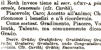 Grdtis; Eucarestia. il Roth invece tiene al sscr. GÙRT-A pia cevole, benvenuto (cfr. Carità). - Piacevole; Caro; Accetto aiPanimo; Oh riconosce i benefizi e n^è ricordevole. Come sostante Gradimento, Piacere, Cfr. Carità; Ve lenta, talento, ma comunemente dices Grado. Beriv. Grado; Gratificare; Gratitudine; Grc tmto; Grratuire; Gratulare, onde Congratulai vK-ràsia.