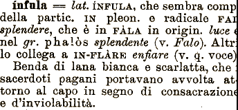 che è in FÀLA in origin. luce ( nel gr. phalòs splendente (v. Falò). segno di infida === lat. ÌNFULA, che sembra comp della partic. IN pleon. e radicale FA] splendere, Altr lo collega a IN-FLÀRE enfiare (v. q. voce^ Benda di lana bianca e scarlatta, che sacerdoti pagani portavano avvolta at torno al capo in consacrazion e d'inviolabilità.