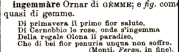 saluto, Di Cernobbio le rose, onde s'ingemma Della regale Olona il paradiso, Ohe di bei fior penuria unqua non soffre. FMonti. Feron. ingemmare Ornar di GÈMME; e fig. com quasi di gemme. Di primavera il primo fior in fine).