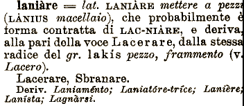 Deriv. Laniaménto; laničre alla pari della voce Lacerare, dalla stessa radice del gr. lakis pezzo, frammento (v. Lacero). Lacerare, Sbranare. === lai. LANIĀRE mettere a pezzi (LĀNIUS macellaio)^ che probabilmente č forma contratta di LAC-NIĀRE, e deriva, Lanwtóre-trice; Lamčre; Lanista; Lagnarsi.