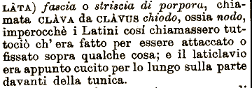 di porpora^ chiamata CLAVA da CLÀVUS chiodo, ossia nodo, imperocché i Latini cosi chiamassero tuttociò eh* era fatto LATA) fascia o striscia per essere attaccato o fissato sopra qualche cosa; e il laticlavio era appunto cucito per lo lungo sulla parte davanti della tunica.