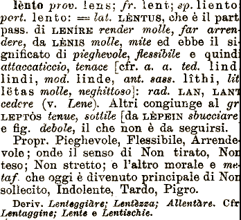 lind lindi, mod. linde, ani. sass. lìthi, IH létas molle, neghittoso}', rad. LAN, LAN'] cedere (v. Lene). Altri conginnge al gr LEPTÒS tenue^ sottile [da LÈPBIN sbucciare e fig. debole, il che non è da seguirsi. Propr. Pieghevole, Flessibile, Arrende volo ; onde il senso di Non tirato, Noi teso; Non stretto; si gnificato di pieghevole^ Allentare. Ctt Lentaggine; lènto prov. lens; Lente e Lentischio. e Paltro morale e me. taf. che oggi è divenuto principale di Noi sollecito, Indolente, Tardo, Pigro. Deriv. Lenteggiare^ Lenfèssa; fr. leni; sp. lienfco pori. lento: ===== lai. LÈNTUS, che è il part pass. di LENIRE render molle, far arren dere, da LENIS molìe^ mite, ed ebbe il flessibile e quind attaccaticcio, tenace [cfr. a. a. ted.