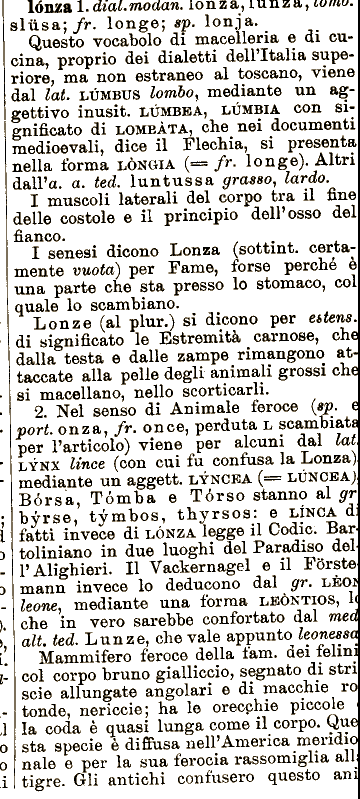 ma non estraneo al toscano, viene dal lai. e di cucina, proprio dei dialetti dell'Italia Altri dalPa. a. tea. luntussa grasso^ lardo. I muscoli e LINCA di fatti invece di LÓNZA legge il Codic. Bartoliniano in due luoghi del Paradiso del l'Alighieri. Il Vackernagel e il Fórste mann invece lo deducono dal gr. LÈOÌ leone^ mediante una forma LEÒNTIOS, 1 che in vero sarebbe confortato dal med alt. ted. Lunze, forse perché è una parte che sta presso LÙMBUS lombo, mediante un aggettivo inusit. LÙMBEA, LUMBIA con significato di lo LOMBATA, che nei documenti medioevali, stomaco, col quale lo scambiano. Lonze (al plur.) si dicono per estens. di significato le Estremità carnose, che dalla testa e dalle zampe rimangono attaccate alla pelle degli animali grossi che sì macellano, nello scorticarli. 2. Nel vocabolo di macelleria superiore, dice il Flechia, si presenta nella forma LÒNGIA (=== fr. longe). laterali del corpo tra il fine delle cestole e il principio del? òsso del fianco. I senesi dicono Lonza (sottint. certamente vuota) per Fame, (con cui fu confusa la Lonza) mediante un aggeli. LYNCEA (=== LÙNCEA; Bórsa, Tómba e Tórso stanno al gr byrse, tymbos, thyrsos: senso di Animale feroce che vale appunto leonessa Mammifero feroce della fam. dei felini col corpo bruno gialliccio, segnato di siri scie allungate angolari e di macchie ro tonde, nericcie; ha le orecchie piccole i la coda è quasi lunga come il corpo. Que sta specie lónza 1. diaLmodan. lonza, lunza, wnw. slùsa;yr. longe; sp. lonja. Questo (sp. e pori. onza, /r. once, perduta L scambiata per l'articolo) viene per alcuni dal lat, LYNX linee è diffusa nell'America meridie naie e per la sua ferocia rassomiglia alii tigre. Gli antichi confusero questo ani