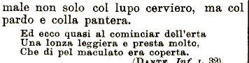 cerviero, ma col pardo e colla pantera. Ed ecco quasi al cominciar dell'erta Una lonza leggiera e presta molto, Che di pel male non solo col lupo maculato era coperta. (''nAitfTir. T'n-F T. 9f\