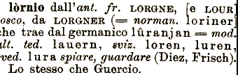 sviz. loren, luren, ved. 1 u r a spiare, guardare (Diez, Frisch). Lo stesso lòrnio àoìVant. fr. LORGNE, [e LOUR] osco, da LORGNER (== norman. loriner] ;he trae dal germanico lùranjan == mod. ili. ted. lauern, che Guercio.
