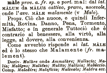 che č contrario al benessere, alla virtų, alla legge, al dovere, male prov. a.fr. sp. e pori. mal: dal lai MĀLUM da MĀLUS cattivo, pravo, nocevole, onde Vavv. MALE malamente (v Malo). Propr. Ciō che nuoce, alla convenienza. MALE ed č lo stesso che Malamente (/r. malement). Deriv. Molare onde Ammalare ; Malescio; MaUā; Maligno; Malioso; e quindi Infermitā, Rovina, Danno, Pena, Tormento, Misfatto; e in generale Tuttociō Come avverbio risponde al lai Malito; Malizia; Malaccio. Comp. Maledire; Maleficio; Malevolo; Malora eco.