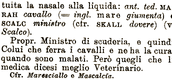 mare giumenta) SCALO i cavalli e ne ha la cura quando sono malati. ministro (ctr. SKALL dovere) (y Scalco). Propr. Ministro di scuderia, e quind Colui che ferra tuita la nasale alla liquida: ani. ted. MA RAH cavallo (=== ingl. Però quegli che 1 medica dicesi meglio Veterinario. Cfr. Maresciallo e Mascalcia.