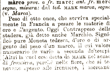 a pesare marco prov. e /r. mare; ani, fr. mer( segno, ed. MARK marco, »eyw (v. Marca). Peso di otto once, che serviva specialmente in Francia misura: dal le materie d: oro e ^argento. Oggi Contrappeso dellf stadera, già detto anche Marchio. Significò pure Moneta tedesca, d'oro o di argento del peso d^un marco, il cui valore numerario fu vario a seconda de'tempi [Altri la vuoi cosi detta da MAKK nel sensc di frontiera^ perché nelle fiere, che si tè nevano spesso alle frontiere, i mercant