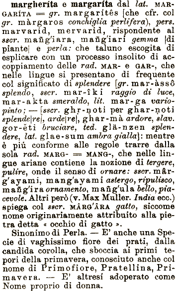 di vaghissimo fiore dei prati, dalla candida splendo, sscr. mar-ìki raggio di luce, mar-akta smeraldo, Ut. mar-ga variopinto;—[sscr. ghr-noti per ghar-noti splende\re\, arde\re\, ghar-mà ardore, slav. gor-èti bruciare, pietra detta occhio di gatto ». Sinonimo di Perla. — E1 anche una gr. margaritès [che cfr. col gr. màrgaros conchiglia perlifera), pers. marvarid, mervarid, rispondente al sscr. mafig'iara, mangiari gemma |di piantei e perla: che taluno escogita di esplicare con un processo insolito di accoppiamento delle alle regole trarre dalla sola rad, MARO- === MANO-, che nelle lingue ariane contiene la nozione di tergere, pulire, onde il senso di ornare: sscr. màrg'ayami, mang'ayami astergo, ripulisco, m a ng'ira ornamento, mang'ula bello,piacevole. Altri però (v. Max Muller. India ecc.) spiega col sscr. MARO'ÀRA gatto, siccome nome originariamente attribuito alla rad. MAR- e GAR-, che nelle lingue si presentano di frequente col significato di splendere [gr. mar-àssó Specie margherita e margarita dal corolla, che sboccia lai, MARGARITA == ted. glà-nzen splendere^ lai. giae-sum ambra gialla]: mentre è più conforme ai primi tepori della primavera, conosciuto anche col nome di Primofiore, Pratellina, Primavera. — E^ altresì adoperato come Nome proprio di donna.