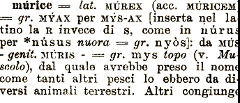 altri MÙRBX (acc. MÙRICEM == gr. MYAX per MYS-AX [inserta nel la tino la R invece di s, come in nùrus per *nùsus nuora == gr, nyòs]: da MXJ - genit. MÙRIS - === gr. mys topo (v. Muscolo), dal quale avrebbe preso il npm come tanti pesci mùrice == lai. lo ebbero da diversi animali terrestri. Altri congiung