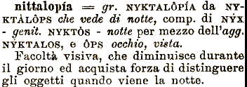 da NYKTÀLÓPS che vede di nòtte, cooap. di NYX - genit. NYKTÒS - notte per me^zo (ieWagg. NYKTALOS, 6 ÒPS OCGhio, vista. Facoltà visiva, che diminuisce durante il giorno ed acquista forza di distinguere gli oggetti quando nittalopia =s= gr. NYKTALÓpiA viene la notte.