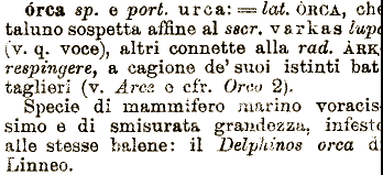 2). Specie órca sp. e por^. arca: ==^o. (v. q. voce), altri connette alla rad. ÀR^ respingere, a cagione de' suoi istinti bat taglieri (v. Arce e cfr. Orco ORCA, eh taluno sospetta affine al sscr, varkas Iwp^ di mammifero marino voracis simo e di smisurata grandezza, infest» alle stesse balene: il Delphinos orca d Linneo.