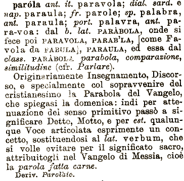 diak sard. e wap. paraula; /r. parole; sp. palabra, ani. paraula; pori. palavra, ani. para-voa: dal &. lai. PARĀBOLA, onde si fece poi PARA VOLA, PARABOLA, Jcome Pavola da FABULA], PARAULA, ed essa dal elass. PARĀBOLA parabola^ comparazione, similitudine si volle evitare per il significato sacro, attribuitegli nel Vangelo di Messia, cioč la parola fatta carne. Deriv. Parolāio. a significare Detto, Motto, e per estģ qualunque Voce parķla ani it. p a r a v o 1 a ; (cfr. Parlare). Originariamente Insegnamento, Discorso, e specialmente passō col sopravvenire del cristianesimo la Parabola del Vangelo, che spiegasi la domenica: indi per attenuazione del senso primitivo articolata esprimente un concetto, sostituendosi al lat. verbum, che