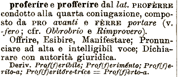 e intelligibil voce; Dichiarare con autorità giuridica. Deriv. ProfCf) ergile; Prof (/ferimento; Prof(f)erito-a; PròfCfjeritdre-trfce proferire e profferire quarta coniugazione, composto da PRO avanti e FÈRRE portare (v. -/ero ; cfr. Obbrobrio e Rimprovero). Offrire, Esibire, Manifestare; Pronunciare ad ^Ita dal lai. PROFERRE condotto alla = Prof(f)erto-a.