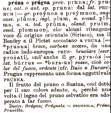 a. ted. prùma, oland. pruim, sved, pi o m m o n], che alcuni ritengono voce di Burare). Prugna rappresenta una forma aggettivale PRÙNEA. Il frutto del pruno o Susina, cosi detto per il suo colore adusto, o, perché una volta prima e prugna prov. pruna;/r. pruno; cai. e ani. sp. pruna: origine orientale (Siriaca), ma il Benfey e il Pictet accostano a PRÙNA f== ^prusnaj brace, carbone acceso, da zina radice indo-europea PRUS- bruciare dal lai. PRUNUM [== gr. proynon e proymnon, angsass. piume, il legno [sscr. prosati], ond5 anche il gr. pyrs-òs [== lat. bùrrus == ^burs-us] rosso^ cioè co' lor del fuoco^ ardente (cfr. Buio e ingl. pi uni, z. scand. ploma, a. del pruno selvatico era adoperato a far fuoco. Deriv. tìr-dgna; Prugnola == PRUNÈOLA; Pruno,