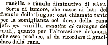 tanto per la somiglianzą col sp. l'ani 11 a malattia, al dorso della rana [cfr. rančlla e ramila diminutivo di RANA. Sorta di tumore, che nasce ai lati del frenulo della lingua: cosi chiamato calcagno dei muli], quanto per I5 alterazione de'suoni, che esso produce, si da ricordare il gracidare della rana.