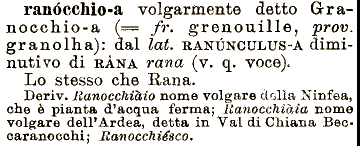 (== fr. grenouille, prov. gran o Ih a): dal lai. RANÙNCULUS-A diminutivo di RANA rana (v. q. voce). Lo stesso che Rana. Deriv. Ranocchiaio nome volgare d'acqua ferma; Ranocchiaia nome volgare delFArdea, detta in Val di Chiana Beocaranocchi; ranócchio-a volgarmente detto G ranócchio-a della Ninfea, che è pianta Ranocchiésco.