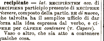 per participio presente di RECIPERE 'icevere, composto della parfcic. RČ di nuovo, ěhe talvolta ha il semplice ufficio di dar 'orza alla idea espressa dal verbo, e ci^RE CAPERE contenere (v. Capere). Vaso o altro, recipičnte ==== lai. RECIPIČNTEM acc. di ěECipiENS che sia atto a contenere malche cosa.