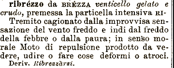 da BRÉZZA venticello gelato udire o fare cose deformi o atroci. Deriv. Ribressarsi. ribrézzo e crudo, premessa la particella intensiva RI Tremito cagionato dalla improvvisa sen- ! sazione del vento freddo e indi dal freddo della febbre o dalla paura; in sen'so morale Moto di repulsione prodotto da vedere,