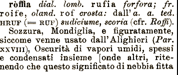 usato dall'Alighieri (Par. xxvm), Oscurità di vapori umidi, spessi e condensati insieme [onde altri, ritenendo che questo significato ròffia dial. lomb, rufia forfora; /r. roife, oland. rof crosta: RDF) sudiciume, scoria (cfr. Roffi). Sozzura, Mondiglia, e figuratamente, siccome venne dall'a. a. ted. HRUF (==== di nebbia fitta