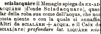 qnas far della roba sua come delPacqua, che nor sosta niente e con la quale si annaffia à.ltri da SCIALAR]? -f- ACQUA, e il Caix da SCIALI are j profondare lai LIQUÀRR scialacquare il Menagio spiega da EX-AD ACQUARE (d^onde Sciadacquarej, scio