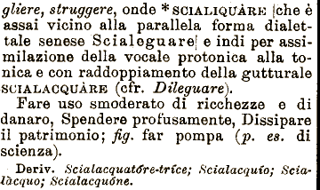 vicino alla parallela forma dialettale protonica alla tonica e con raddoppiamento senese Scialeguare] e indi per assimilazione della vocale glierCy struggere^ onde * SCIALIQUARK |che è assai della gutturale SCIALACQUARE (cfr. Dileguare). Fare uso smoderato di ricchezze e di danaro, Spendere profusamente, Dissipare il patrimonio; fig. far pompa (p. es. di scienza). Deriv. Scialacquatffre-tnce; Scialacquio; Scialàcquo; Scialacquóne.