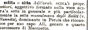 aggettivo formato sulla voce sci" rA'A setta in generale e pił particolar[nente sciita o siita daU?ara&. SCIYA^I propr. ģeitari^ la setta mussulmana degli Sciiti (v. Sunnita)^ dominante in Persia che riconosce per suo capo Ali, genero e quarto successore di Maometto.
