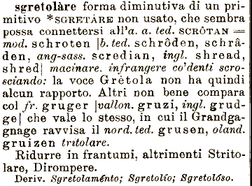 scredian, ingl. shread, *SGRETÀRE non usato, che sembra possa connettersi all'oc, a. ted. SCRÓTAN == mod. schroten \b. ted. schróden, non bene compara col fr. gruger \vaìlon. gruzi, ingl. schràden, ang-sass. .shred| macinare, infrangere condenti scrosciando: la voce Grétola non ha quindi alcun rapporto. Altri sgretolare forma diminutiva di un primitivo grudge| che vale lo stesso, in cui il Grandgagnage ravvisa il nord.ted. grusen, oland. gruizen tritolare. Ridurre in frantumi, altrimenti Stritolare, Dirompere. Deriv. Sgretolaménto; Sgretolio; Sgretoloso.