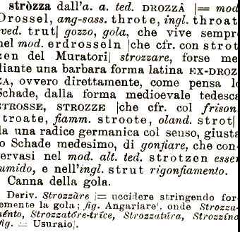 e TiQÌVzngl. strut rigonfiamento. Canna della gola. Deriv. Strozzare j== uccidere stringendo for amenfce la gola ; fig. Angariare;, onde Strozzatento, Muratori) strozzare, stròzza dalPa. a. ted. DROZZA |== mod 3rossel, ang-sass. throte, ingl. throat ved. trat| gozzo, gola, che vive sempr lei mod. me [lante una barbara con sfcrot sen del forse forma latina EX-DROZ !A, ovvero direttamente, come pensa L 5chade, dalla forma medioevale tedesca ITROSSE, STROZZE |che cfr. col frison fcroate, fiamm. stroote, oland. strotj [a una radice germanica col senso, giusti o Schade medesimo, di gonfiare, che con ervasi nel mod. alt. ted. strotzen essei umido, erdrossein |che cfr. Strcssato're-tr'Cce^ Strozzatura, Strozzino fìg. ^— Usuraio j.