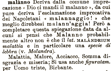 data da alcuni si pensi che Malanno probabilmente altro non è che i), lai. MALÀNDRIUM malattia e in particolare una specie di lebbra (v. Malandrà). Malattia, Malore, « Dio ci mandi il malanno », da cui pure deriva P esclamazione imprecativa dei Napoletani « malannaggio! » che malanno Deriva dalla comune imprecazione meglio direbbesi malannaggia! Però a completare questa spiegazione Acciacco, Somma disgrazia e miseria ; Si usa anche figuratam. per Uomo triste, Birbante.