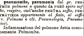 pnenmonia dal gr. PNESTMÓN polmone e questo da PNČŌ spiro sof^o, respiro, ond'anche PNE^MA soffio^ PNEfMĀTiKOS appartenente al fiato, al soffio v. Polmone e cfr. Pneumologia, Pneumatico). Infiammazione del polmone detta conniaemente pnenmonite, Polmonite.