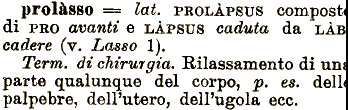 da LĄB cadere (v. Lasso 1). Terw. J» chirurgia. prolasso == lai. PROLĄPSUS compose di PRO avanti e LAPSUS caduta Rilassamento di nni parte qualunque del corpo, p» es. delL palpebre, dell'utero, dell'ugola ecc.