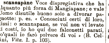 che ha ilquanto più forza di Mangiapane ; e vale Jomo disutile buono solo a divorar pagnotte: p. es. « Conosciuti certi di levate li costi, io ho qui due falconetti parati, iQ'quali io farò polvere di voi » (B. Gelini, Vita. I. p. 103). loro, [issi: o scannapane, se voi non vi scannapane Voce dispregiativa