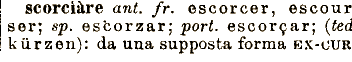 ani. fr. escorcer, escour sor; sp. escorzar; pori. escorcar; scorciare (tea kùrzen): da una sapposta forma EX-CUR