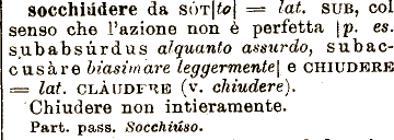 assurdo, subacc socchiudere da SÓT|^[ == lai. SUB, col senso che Fazione non č perfetta jp. es. subabsłrdus alquanto usa rč biasimare leggermente\ e CHIUDERK == laf. CLĄliDr^E (v. chiudere). Chiudere non intieramente. Part. pass. Socchiuso.