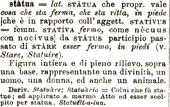 == femm. STATI VA fermo^ come nōcuuy con stātua === lat. STĀTUA che propr. vale cosa che sta ferma^ che sta ritta., nocivusj' da STATUS participio passato di STARE esser fermo^ in piedi in piede (v. Stare, Statuire). Figura intiera e di pieno rilievo, sopra una base. rappresentante una divinitā, un uomo, una donna, ed (che č in rapporto coli' aggeli. STATIVUS anche un animale. Deriv. Statuāre; Statuārio = Colui che fu statue ; ed applicato a marmo Atto ad esser scol pito per statua, Statuétt-a-ina.