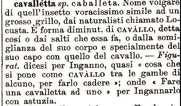 salti che essa fa, o dalla somiglianzà del suo corpo e specialmente del suo capo con quello del cavallo. — Figurai, dice.si per Inganno, quasi « cosa che si pone come CAVALLO tra le gambe di alcuno, per farlo cadere »; onde « Fare una cavalletta ad uno ome volgare di quel? insetto voracissimo simile ad un grosso ^grillo, dai naturalisti chiamato Locusta. E forma diminuì, di CAVALLO, detta cosi o dai » per Ingannarlo con astuzia. cavallétta sp. e a b a 11 e t a. JN
