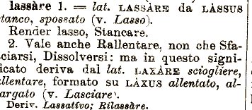 non che Sfalciarsi, Dissolversi: ma in questo signiìcato deriva da LÀSSUS 'tanco, spossato (v. Lasso), Render lasso, Stancare. 2. Vale anche Rallentare, lassare 1. === lai. LASSAR® dal lai. LAXÀBB sciogliere, dentare, formato su LÀXUS allentato, alargato (v. Lasciare^. Deriv. Lassativo! Rilassare»