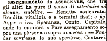 da ASSEGNARE, cne tra gli altri ha pure il senso di attribuire ad alcuno, stabilire. — Rendita assicurata; Rendita vitalizia e a termini fissi; e fig. Aspettativa, Speranza, Conto, Capitale, onde Fondar sovr'essa le sue speranze, assegnamento la maniera « Fare assegnamento sopra una persona o sopra una cosa » === Contarci.