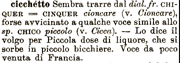 dose di liquore, che si sorbe in piccolo cicchétto Sembra trarre dal dial.fr. CHIQUER == CINQUE R cioncare (v. Cioncare)^ forse avvicinato a qualche voce simile allo sp. CHICO piccolo (v. Cicca). — Lo dice il volgo per Piccola bicchiere. Voce da poco venuta di Francia.
