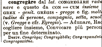 tudivie di persone^ Congrega; Congregcbbile; congregare dal lai. CONGREGARE radv nare e questo da CON ===== CTJM insieme GRBX - genit. GRÈGIS - gregge e fig. molti compagnia, setta, scuoi (v. Gregge e cfr. JSgregio).— Adunare, Ra cogliere insieme, Convocare più person per un fine determinato. Deriv. Oo-ngregaméntf. Congregazione