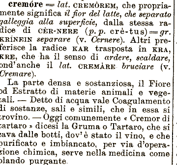 la radice KAR trasposta in KRA, KRE, che 'ha il senso di ardere, scaldare, ond'anche il lat. CREMARE bruciare (v. Cremare). La parte densa e sostanziosa, il Fiore 3d Estratto di materie animali e vegetali. — Detto di acqua vale cremóre ====== !at. CREMÒREM, che propriamente significa il fior del latte, di CÈR-NERE (p. Coagulamento li sostanze, sali e simili, che in essa si « Cremor di bartaro » di cesi la Gruma o Tartaro, che si sava dalle botti, dov5 è stato il vino, e che oùrifìcato e imbiancato, per via d^operasione chimica, ^rovino. — Oggi comunemente p. crè-tus) ===^r. KRINEIN separare (v. Cernere). Altri preferisce che separato galleggia alla superficie, dalla stessa radice serve nella medicina come alando purgante.