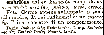 Feto; Germe appena sviluppato in seno alla madre; Primi rudimenti di un essere; fig. Primo concetto embrióne dal gr. ÈMBRYÒN comp. da EN in e BRY-Ò germino, pullolo, nasco, cresco. di un componimento. Deriv. Embrionale; Embrionico. Comp. Embrio' -gema; Embrio-logia; Embriotomia.