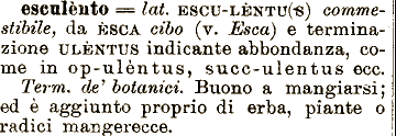 da ESCA cibo (v. Esca) e terminazione ULÈNTUS indicante abbondanza, come in op-ulèntus, succ-ulentus ecc. esculènto === lai. ESCU-LÈNTU(-S) commestibile, Term. deì botanici. Buono a mangiarsi; ed è aggiunto proprio di erba, piante o radici mangerecce.